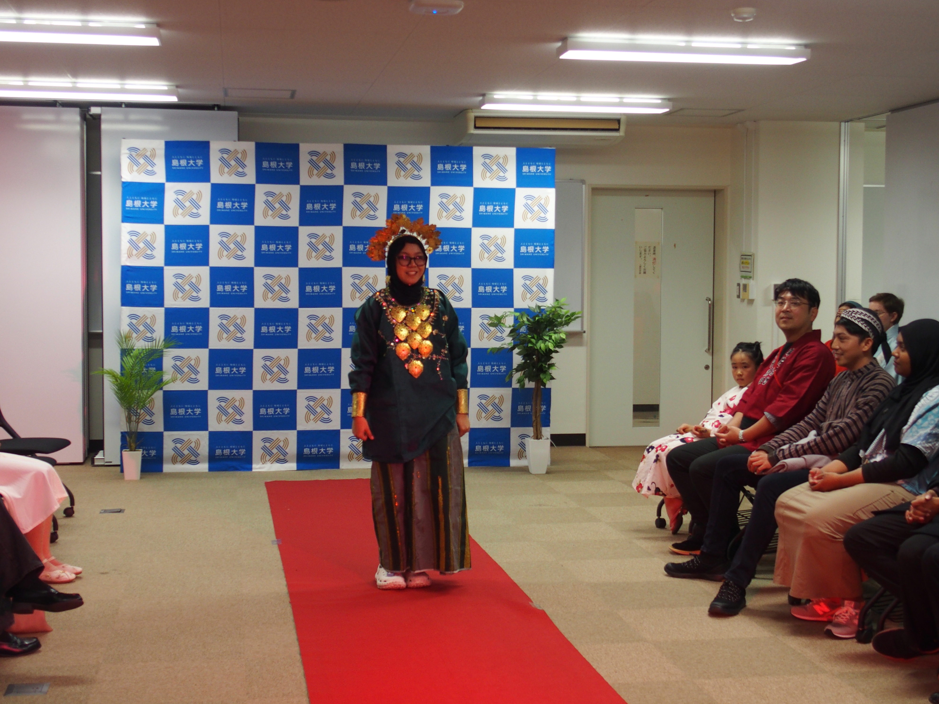 Following the address, the highlight of the evening, the “red-carpet fashion walk” began. Models walked the red carpet wearing the traditional clothing of their home countries, introducing themselves by name, country, and the name of the attire they wore. They also offered a short greeting in their native languages, saying “Welcome to Shimane University.” The walkway was filled with colorful and diverse outfits, including Indian saris, Ukrainian vyshyvanka, Colombian manta, Indonesian batik and more, creating a lively and engaging atmosphere.